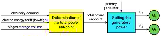 The technical solution for demand-supply management consists of a two-level control algorithm (Figure 2). The upper control level determines the desired total output power of the generators. The total output equals the current electricity demand of the plant but also considers the energy tariff and the available biogas storage. The lower-level control then adjusts the output power of the individual generators accordingly in order to achieve the desired total power.