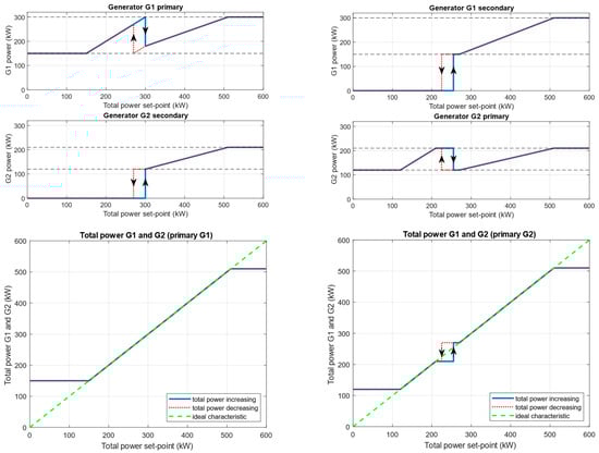 Figure 4 shows two situations with generators G1 and G2 as primary generators. The algorithm for setting the power for each generator is shown in Supplementary Material S1. In the case of G1 as the primary generator, inequality (2) holds for kW. Therefore, by selecting kW, the ideal characteristic curve is obtained over the entire range between the minimum power of G1 and the sum of the maximum powers of both generators (Figure 4, left). In the case of G2 as the primary generator, inequality (1) fails for any positive hysteresis value and the target total power cannot be fully achieved (Figure 4, right). The deviation occurs when the total power set-point is between and . By selecting kW and adjusting the switch-on and switch-off conditions for the secondary generator (see algorithm in Supplementary Material S1), the maximum theoretical error is 45 kW, which corresponds to up to 20% of the desired total power. Since exact tracking of the actual consumption by the CHP system is not required, the solution presented is considered sufficient. Note that G1 cannot always be the primary generator, as both generators must have a similar number of working hours.