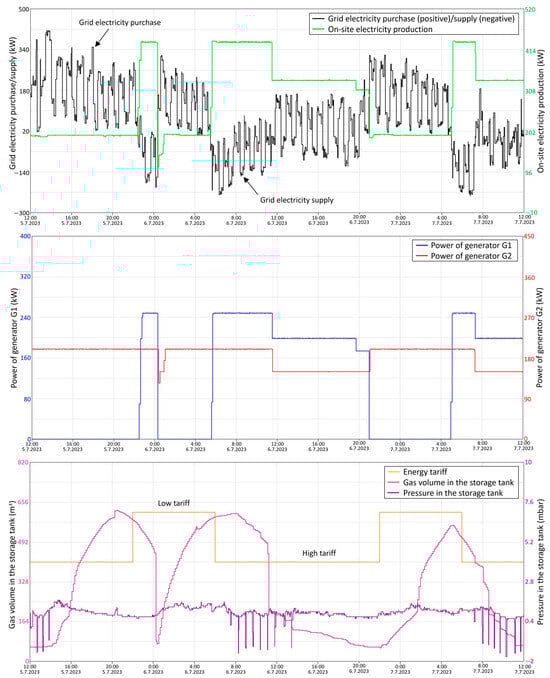 Operation of electricity generators after implementation of the dynamic control of generators: grid electricity purchase/supply and on-site electricity production (top); power of generators G1 and G2 (middle); energy tariff, volume and pressure in the gas storage tank (bottom).