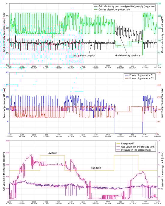Figure 7 shows an example of the initial operation of the electricity generators for two days. The top diagram shows the purchase and supply of grid electricity, indicated by positive and negative values of grid electricity. Most of the time, additional electricity was purchased from the grid since the electricity generated on-site by switching the generators on and off was insufficient, except for short periods when it exceeded demand. The middle diagram illustrates that the power of generators was only adjusted slightly in rare cases during operation. Switching the generators on and off was not optimal in relation to the gas volume in the storage tank, as can be seen in the bottom diagram. In addition, the measurements of the biogas volume were not entirely reliable, as evidenced by a sudden drop or increase in the biogas volume when the membrane cover of the storage tank was bent.