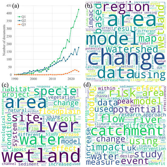 (a) The frequency of the research documents (papers in journals and proceedings of conferences, books, and chapters of books) related to land cover and inundations (Q1), the mitigation of inundations and restoration (Q2), and natural flood management (Q3); (b) a word cloud of the abstracts of the documents that resulted from search Q1, (c) a word cloud of the documents that resulted from search Q2, (d) and a word cloud of the documents that resulted from search Q3.