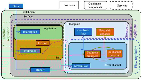 Interactions between watershed components and processes that determine the runoff, streamflow, and overbank flow characteristics. The different processes occurring within watersheds provide ecosystem services, including storage, erosion regulation, and streamflow regulation.
