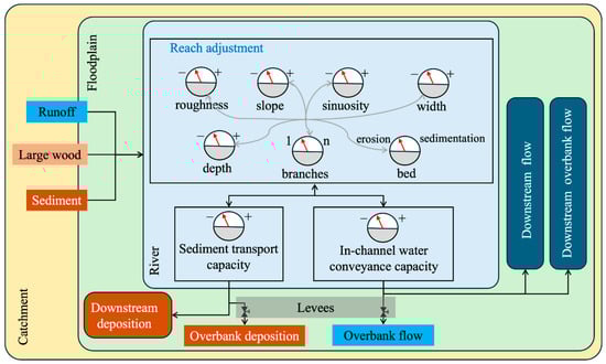 The flow, sediment load, sediment size, and slope in a channel are interconnected; if one is altered, the others are modified to return to equilibrium [60]. Such processes of alluvial rivers are driven by their capacity to self-adjust so to dissipate excess energy and convey the water and sediment load provided from upstream reaches [61]. There is evidence that changes in channel cross-sections driven by LULC alter the local channel capacity, e.g., [62]. Another factor to consider is human intervention. The management and control of streamflow carried out in upstream reaches is one example of the anthropogenic alterations of river systems; such direct alterations change the flow and sediment load regimes, which shapes the morphology of alluvial streams [7]. For instance, across Europe, it has been identified that river training, the commissioning of hydraulic structures, and the removal of flood areas have all led to changes in the river morphology and water depth, thereby altering the flow wave propagation, and, therefore, modifying the peak, timing, and shape of the flood hydrograph [63]. The adjustment of one attribute of the channel triggers a change in other attributes, and ultimately regulates the flow conveyance and sediment transport capacities of the river. Rectification, dredging, and the widening of channels increases the hydraulic capacity and results in the faster drainage of upstream areas, thus concentrating the flow more rapidly toward the downstream areas [24]. The 20th century was a period of intense river engineering. Rivers were dredged and channelized, and these actions were accompanied by the construction of levees and dams to mitigate the impact of floods [64]. For instance, Ole [65] exposed that, during the 20th century, most of the streams in Denmark were channelized to drain to areas devoted to agriculture, industry, and urban zones. In Slovakia, this solution against floods was also common; it aimed to accelerate the drainage of affected areas [66]. Brookes [67] categorized channelization actions into the following four classes: (1) the widening, deepening, or straightening of the channel; (2) the removal of logs, vegetation, and obstacles from the streamflow, which modifies the channel roughness (CR in Figure 2); (3) the construction of levees to limit the overbank flow (see Figure 3); (4) bank stabilization. Modification types (1) and (2) involve increases in the hydraulic capacity due to the change in the channel geometry and roughness; consequently, this leads to a magnification of the shear stress acting on the perimeter [56]. The same authors exposed a case where channelization increased the stream slope, hydraulic radius, and velocity, resulting in an intensification to the sediment transport capacity by a factor of 15 to 50. Such conditions generate an imbalance in sediment transport, which propagates upstream and downstream, with implications for the flow conveyance capacity of the channels. Figure 3 depicts the input to rivers and the responses and interactions with the floodplain regarding the transference of water and sediment in response to runoff, sediment, and large wood entering the streams. Rivers can adjust their geometrical characteristics (the slope, width, and planform) and hydraulic characteristics, such as the roughness and water depth. Table 3 lists some of the cases related to river morphological change induced by alterations in the catchment and the effect on floods.