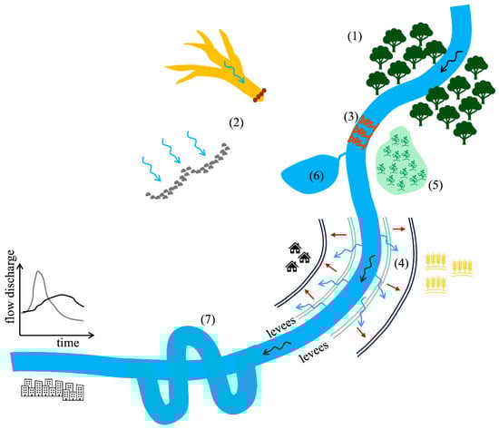 Another factor that can contribute to increased flood risk in downstream regions is the modification of the lateral connectivity of rivers. Corridors where rivers and wetlands develop and interact were a common feature globally that have been diminished by anthropogenic activities, and which today are commonly unknown to river managers [73]. Levee construction next to river banks to maximize land use has incentivized development in flood-prone areas [74]. For instance, Ding et al. [75] assessed how both levee construction and urban expansion are linked in the contiguous United States; they found that levee construction was associated with a 62% acceleration in floodplain urban expansion, while the average in the country was 29%. Rivers and their floodplains are components of a single dynamic system [76,77], in which floods are the mechanism that trigger interaction through overbank flows. However, prevailing river management approaches consider that the flow occurs mainly within the channel, where occasional flooding of its floodplains takes place, although there is increasing evidence that these types of conditions are a historical legacy, that is, a consequence of anthropogenic alterations [78]. Since the second half of the last century, it has been recognized that natural rivers are actively connected to off-stream environments [79]. The lateral dimension of alluvial rivers (near overbank zones) experiences a cyclic expansion and contraction, caused by seasonal variation in floods, that generates an interaction between the channels and their floodplains. For instance, ref. [80] estimated that, in the Amazon River, there is an exchange with its floodplains of approximately 25% of the mean annual flow. Modi et al. [18] highlighted the importance of the river space provided by floodplains by considering the hydraulic, geomorphological, and biological interactions generated by flood pulses. Vertical accretion resulting from sediment deposition during channel overbank flow generated by floods is one of the processes related to floodplain formation [81]. Knox et al. [6] described that artificial levees built on riverbanks to protect infrastructure disconnect floodplains and compromise the biodiversity of the riparian region; it also has implications for flooding in the short- and mid-term. When a river is connected to its floodplains, the latter functions as temporary storage for various materials [82]. Temporary storage in the floodplains during floods helps to reduce peak flows in downstream reaches and diminishes the probability of overbank flows. For instance, Farrag et al. [83] analyzed the interactions of floodplain storage and flood risk in the German part of the Rhine basin. Their results indicated that floodplain storage lowers water levels and discharges, reducing risks by over 50%. In addition, during overbank flow, there may also be sediment transfer to the floodplains. For instance, Rodríguez et al. [84] studied the flood-driven overbank sedimentation in the lower Orinoco floodplain, and estimated deposition rates in the floodplain ranging from 0 to 225 kg m−2 yr−1, depending on factors such as the distance from the river banks and vegetation cover. When the connection of rivers with their floodplains is interrupted by levees, the transference of sediment to the floodplains is interrupted, and the sediment is transported downstream and deposited, thereby altering the hydraulic capacity of the rivers. Floodplains provide the service of sediment storage that otherwise would be transported downstream (see Figure 2), with the risk of the sedimentation of rivers.