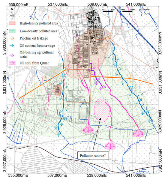 High-density zones correlate with direct leakage from pipelines and tanks, while low-density areas reflect secondary pathways such as oil-laden irrigation water and qanat-mediated transport. Figure 3 highlights aged infrastructure and contaminated surface drainage as key contributors to peripheral pollution. A hydrogeological analysis indicates that secondary zones are sustained by persistent migration from high-density cores, creating an interconnected contamination network. These findings challenge passive remediation paradigms, advocating instead for immediate intervention in high-density zones (e.g., TORC, REY7) and stringent controls on secondary dispersal pathways to mitigate long-term environmental and public health risks.