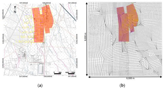 (a) The Simulation area and (b) 2D geometry and mesh used.