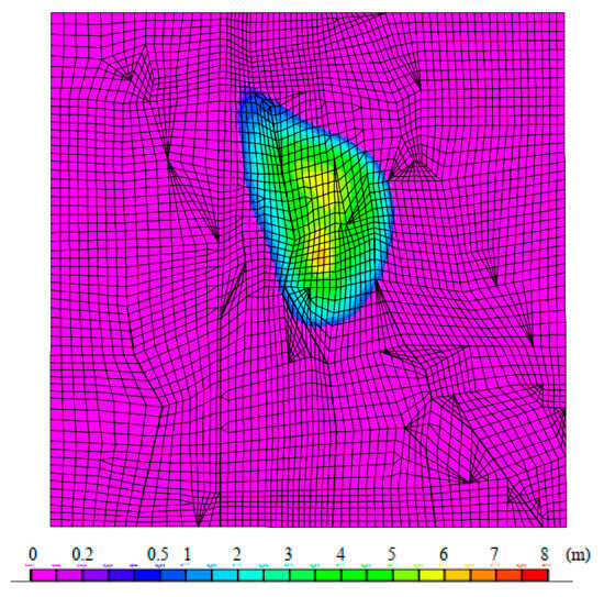 After one year, the attenuation of the oil plume became more evident, particularly in the central high-thickness zones (Figure 11b). The region with plume thickness exceeding 6.5 m contracted significantly, suggesting ongoing natural processes such as dissolution and minor biodegradation. However, the overall shape of the plume showed limited lateral expansion, with the boundary of the 0.5 m thickness region remaining relatively stable. The southward migration of the plume, driven by groundwater flow, was minimal, with only slight displacements observed at the southern edge of the domain. This reflects the weak hydraulic gradient and the soil’s restrictive permeability, which hinder significant contaminant transport.