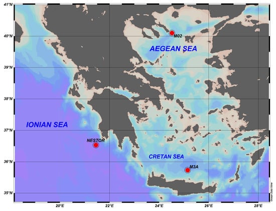 Sampling stations (red bullets) during 2014 and 2015 expeditions: North Aegean Sea (M02), Ionian Sea (NESTOR), and Cretan Sea (M3A).