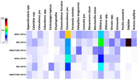 Heat map with dominant zooplankton abundances (Calanidae cop. refers to the total number of copepodites from the Calanidae family).