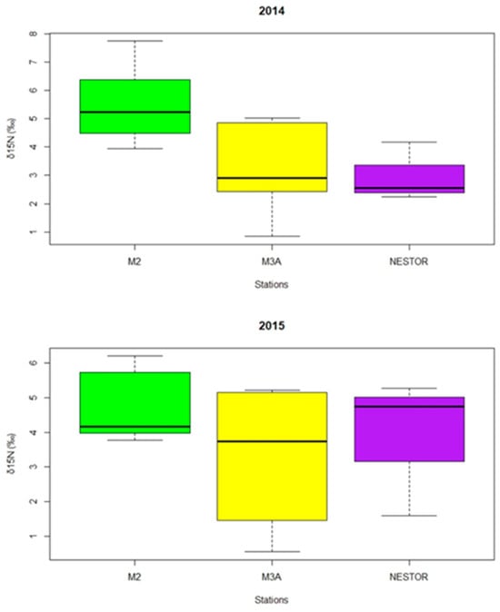The analysis of stable isotopes of nitrogen (δ15N) and carbon (δ13C) provided valuable insights into the trophic ecology of prominent copepod taxa. The δ15N values for various copepods exhibited considerable variability between stations and years, with H. longicornis and Corycaeus spp. showing the highest δ15N values for 2014, whereas C. typicus and C. helgolandicus for 2015, indicating differences in their trophic positions and feeding strategies []. The higher δ15N values at station M02, followed by M3A and NESTOR, further support the notion of spatial variability in nitrogen cycling and food web dynamics across the Mediterranean Sea, as previously observed by Koppelmann et al. [] and Krom et al. []. These differences in isotopic signatures reflect both the local nutrient dynamics and the specific feeding behaviors of different copepod species, with some taxa potentially feeding at higher trophic levels or incorporating nitrogen from different sources, such as nitrogen fixation or dissolved organic nitrogen [].