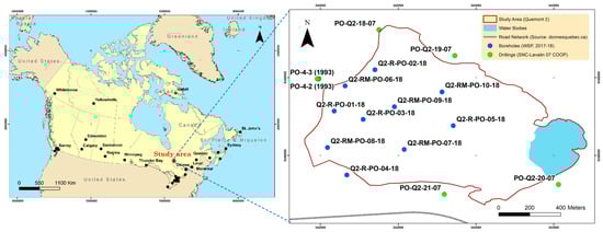 Field measurements: In November 2021, additional investigations were conducted as part of this study to measure hydraulic head, temperature, and water electrical conductivity (Research Institute on Mines and the Environment (IRME) laboratory, Rouyn Noranda, QC, Canada). In 2018, Solinst Levelogger Edge probes were installed in wells Q2-RMPO-09-18, Q2-R-PO-03-18, Q2-RM-PO-06-18, and Q2-R-PO-01-18 for hydraulic heads monitoring [44]. Data were collected between 5 November 2020, and 3 June 2022, at hourly intervals. Additionally, a Barologger installed at well Q2-R-PO-03-18 monitored atmospheric pressure, enabling correction of piezometric levels obtained with the Levelogger probes.