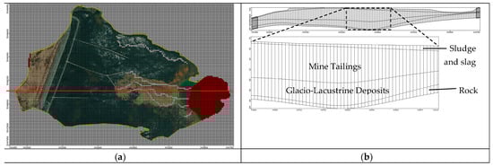 The model discretization of Quémont 2 TSF, showing inactive zone (gray) and active zone. (a) Plan view of the spatial discretization for the numerical model and location of the cross-section profile (b) A cross-section of the research area from west to east, displaying the hydrogeologic units and a vertical spatial discretization of the study area.