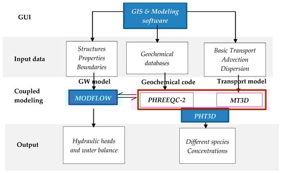 A reactive multicomponent transport model based on MODFLOW/MT3D was recently developed by [65]. This model solves various mixed equilibrium and kinetic reactive transport problems by sequentially coupling the geochemical model PHREEQC-2 [66] with the three-dimensional transport simulator MT3D [64] (Figure 6). The model can solve both equilibrium and kinetically controlled reactions, with total aqueous component concentration serving as the main dependent variable [67,68].