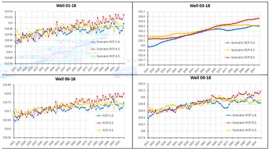 Time series plots based on the climatic data, which summarize the most up-to-date knowledge on the study area’s climatology, are presented in Figure 2a,b. These figures illustrate the predicted evolution of P and T for the coupled model intercomparison project 5 (CMIP5) climate model, considering multiple scenarios used to study the future impact of climate change (CC). The scenarios include the Representative Concentration Pathways (RCPs) 2.6, 4.5, and 8.5, which have been analyzed and edited for this study.