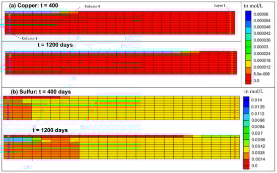 The movement of pollutants through porous media is governed by complex mechanisms. These processes are formally described in the model, with differential equations applied using the field data provided in Table 4. The concentrations of iron, sulfur, and other components were assessed based on groundwater quality measurements, supplemented by kinetics tests conducted by [43] on Quémont 2 materials.