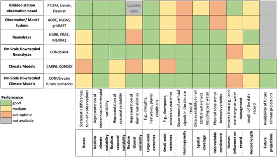 Qualitative assessment of the strengths and weaknesses of meteorological forcing datasets used for water quantity and quality assessments. Assessments are relative between forcing datasets (rows), showing better-performing forcings in green and sub-optimally performing approaches in red for different categories (columns); adapted from [183]. Additional info on named meteorological forcing datasets is provided in Table 1 of the companion data release [102]. Specific datasets: PRISM [194]; Livneh [195]; Daymet [196]; AORC [197]; NLDAS [198]; gridMET [199]; NARR [200]; ERA5 [201]; MERRA2 [202]; CONUS404 [183]; CMIP6 [180,188]; CORDEX [189].