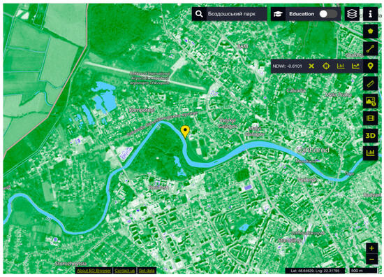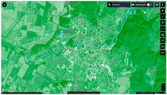 Remote sensing data were integrated into the analysis to assess land-water interactions and hydrological conditions within Uzhhorod’s territory. Using the EO Browser platform, a map of the city’s terrain was generated. The Normalized Difference Water Index (NDWI), a widely accepted measure for water body detection, was employed to identify and delineate water features. High-resolution satellite imagery and temporal NDWI values provided insights into the distribution and extent of surface water. By comparing these indices to known urban structures and green spaces, the study was able to determine areas most impacted by hydrological changes. These findings informed subsequent stages of analysis, including infrastructure planning and environmental impact assessments [26].