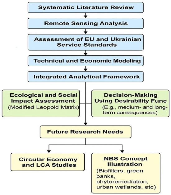 The diagram illustrates each core methodological step, from bibliometric and geospatial analysis to physical modeling and environmental impact assessment. It also highlights future research directions, including integration of circular economy models, life cycle assessment (LCA), and nature-based solutions (NBS), such as biofilters, riparian green belts, urban wetlands, and phytoremediation techniques. Color-coded elements in the diagram distinguish between the completed stages of the study and those planned for subsequent research phases. This visual representation reinforces the interdisciplinary nature of the study and supports replicability in other climate-exposed urban river contexts.