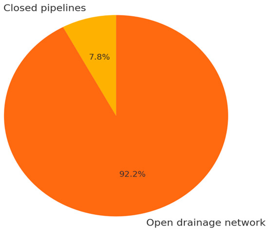 Approximately 25% of the left-bank area operates under a separate sewer system, while the rest of the city remains dependent on the outdated combined model. According to the Department of Municipal Infrastructure, the stormwater drainage network extends 117.2 km, with only 9.2 km consisting of closed pipelines, as shown in Figure 3.