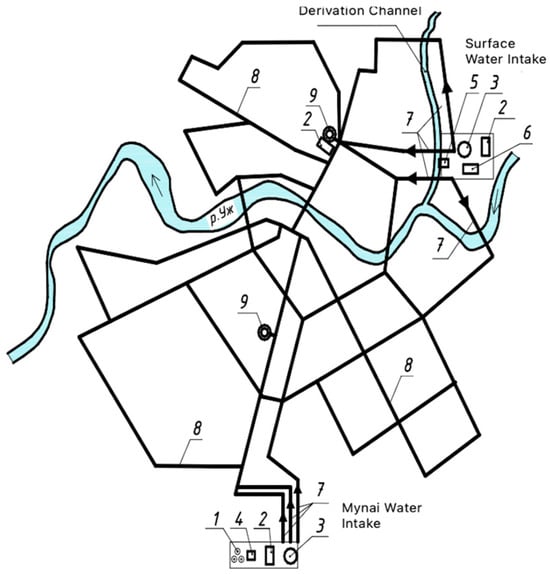 (1) Water intake “Mynai”: 1—water intake facilities (water intake wells) with pumping stations of the first lift; 2—clean water tanks (CWT); 3—pumping stations of the second lift; and 6—water treatment facilities.