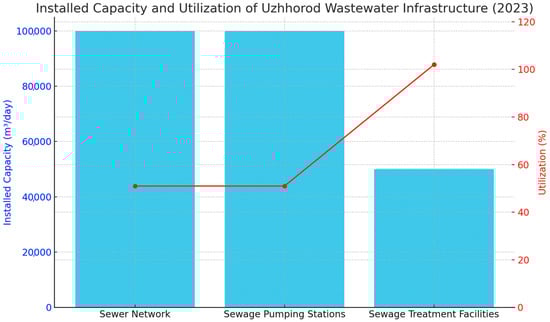 Blue bars show installed capacity (m3/day); the red line represents current utilization as a percentage. The stark contrast between sewage treatment plant overload (102%) and underutilized sewer networks (51%) suggests hydraulic mismatch and calls for urgent balancing interventions.