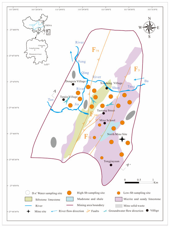 The North Mine of Xikuangshan Sb mining area is located 13 km north of the city of Lengshuijiang in Hunan province, China, between 111°30′00″–111°31′22″ E and 27°46′00″–27°48′00″ N. It covers approximately 0.50 km2 in a mountainous region with a mean annual precipitation of approximately 1382 mm and mean annual evaporation of approximately 903 mm [4,5,9]. The study area is impacted by an F75 fault to the west and a lamprophyre vein to the east (Figure 1). The Magunao Aquifer (D3s2 groundwater) and Shetianqiao Aquifer (D3x4 groundwater) constitute the two primary aquifers under investigation, exhibiting limited hydraulic connectivity with each other. Large residential areas, grasslands, vegetable plantations, and abandoned mining residual slags cover the weathered D3x4 water layer.