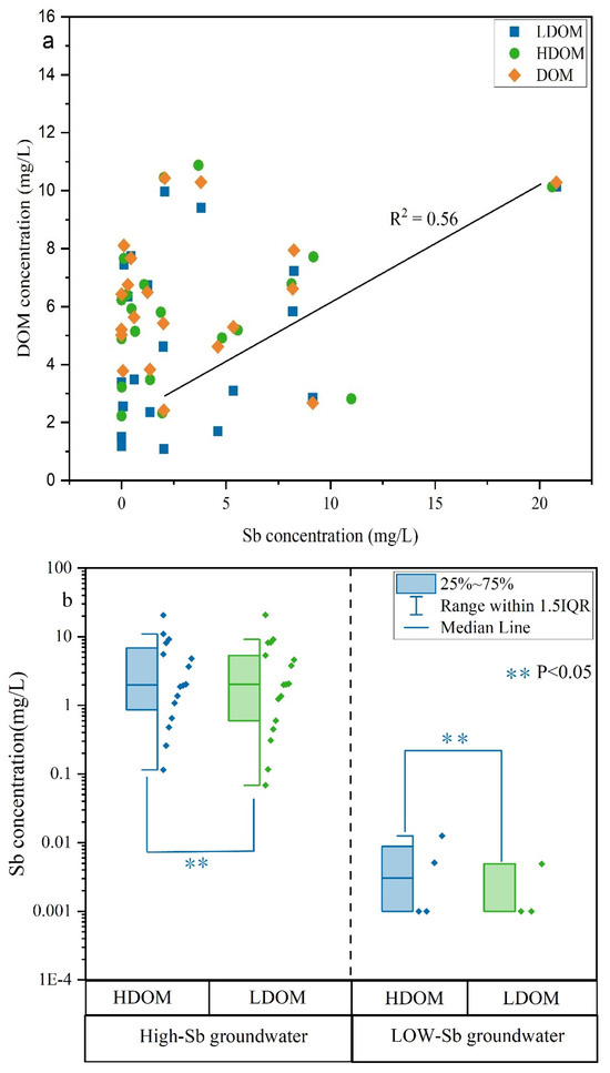 Plots of (a) the association between DOM and Sb concentration and (b) boxplots illustrating the Sb concentration differences in groundwater with high and low Sb levels, categorized by HDOM and LDOM.