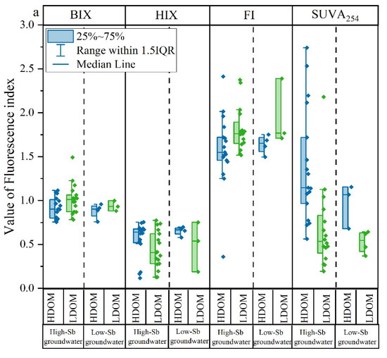 Fluorescent characteristic indicators such as BIX, HIX, FI, and SUVA254 of the HDOM and LDOM groundwater are shown in Figure 3a and Table S1. Compared with the HDOM groundwater samples, BIX slightly increased, whereas HIX and SUVA254 obviously decreased in the LDOM groundwater samples, indicating a stronger biological source and less humic character in the LDOM [27,29]. Moreover, the FI value slightly increased from a mean value of 1.64 (terrestrially and microbially derived zones) in HDOM groundwater to a mean value of 1.78 (microbially derived zones) in LDOM groundwater [44,45,46,47,48], further demonstrating a larger contribution from microbial sources in LDOM [44,49,50]. Notably, low-Sb groundwater had similar HIX, SUVA254, FI, and BIX values to those of high-Sb groundwater, suggesting that the fluorescence characteristics of LDOM were dominant in both high- and low-Sb groundwater.