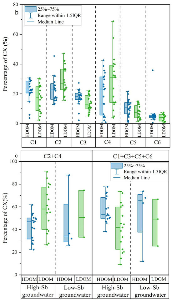 Six different fluorescent components (C1, C2, C3, C4, C5, and C6) were successfully identified in all high- and low-Sb groundwater samples using the PARAFAC models. C1, C3, C5, and C6 had similar excitation and emission wavelengths and were aligned with humic-like substances. In contrast, C2 and C4 were categorized as protein-like components [5,51,52]. In contrast to HDOM, the relative proportions of C1, C3, C5, and C6 in LDOM groundwater samples decreased noticeably, whereas a significant increase was observed in the relative proportions of C2 and C4 (Figure 3b). These findings suggest that protein-like compounds from microbial sources were predominantly observed in the LDOM groundwater samples.