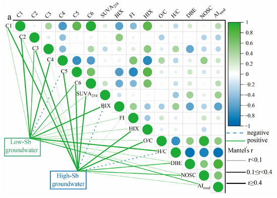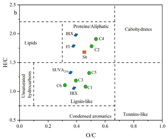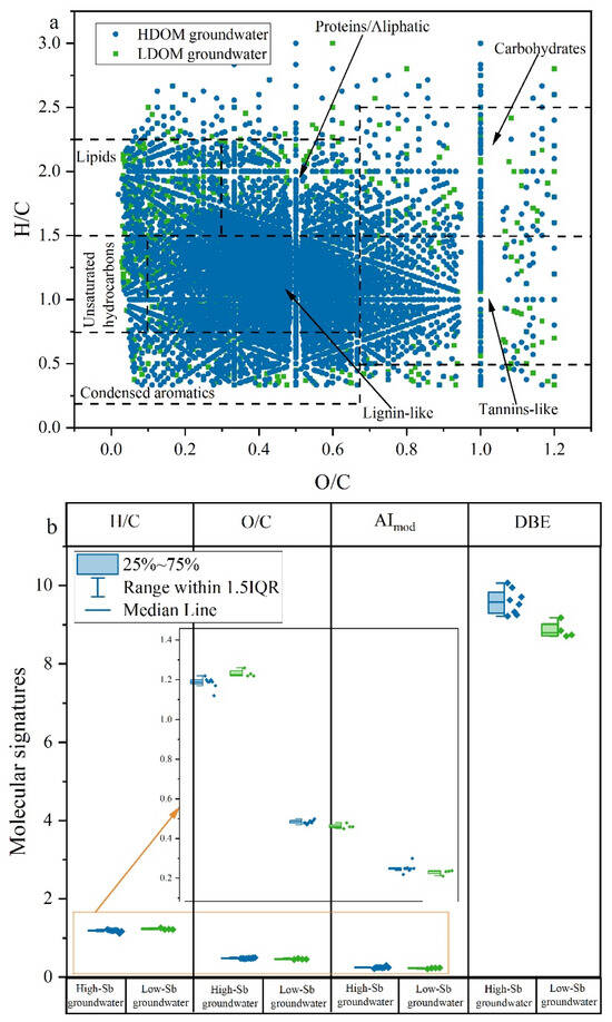 Based on the correlations with Sb concentrations in the LDOM groundwater, the optical properties, PARAFAC components, and molecular characteristics of the DOM were divided into two categories, as shown in Figure 5a. The HIX, SUVA254, C1, C3, C5, C6, and O/C ratios were positively correlated, indicating the presence of more stable and aromatic DOM components. In contrast, the second group, which included BIX, FI, C2, C4, H/C ratio, DBE, and AImod, exhibited negative correlations, reflecting more reactive DOM components. Generally, the high-Sb groundwater DOM exhibited higher HIX, SUVA254 values, and O/C ratios in Figure 5a, while exhibiting lower BIX values and H/C ratios compared to low-Sb groundwater DOM. This suggests that the high-Sb groundwater DOM was more unsaturated, richer in humic substances, and less susceptible to biodegradation. These findings are consistent with those of earlier studies by Hao et al. (2022) and Jia et al. (2023) [5,11], further confirming that the increased prevalence of recalcitrant organic compounds in high-Sb groundwater likely contributes to Sb enrichment.