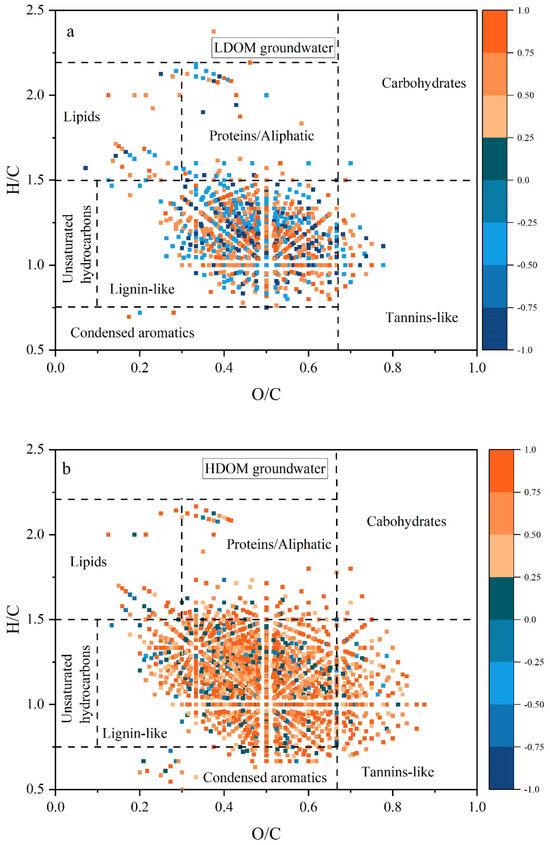 Using the H/C and O/C ratios, the LDOM and HDOM constituents were classified into seven distinct groups within a van Krevelen diagram [25,29,34], as shown in Table 2. Among these compounds, those with a higher H/C ratio (H/C > 0.50) have previously been classified as bioreactive DOM [25,27], whereas those with a higher O/C ratio (O/C > 0.50) exhibit greater humic DOM characteristics [39,43].