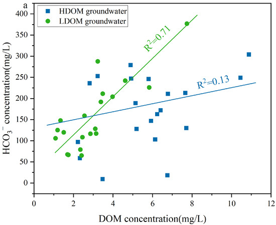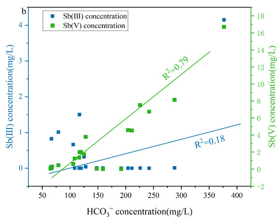 Correlation analysis of (a) DOM concentration and (b) Sb(V) and Sb(III) concentration versus Sb concentration versus HCO3− concentration in LDOM groundwater.