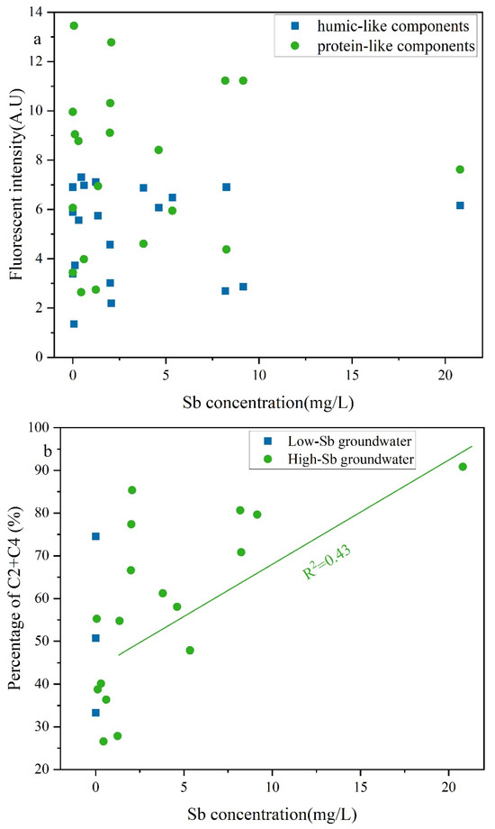This observation provides further evidence that protein-like components were dominant in high-Sb groundwater DOM, whereas humic-like components were predominantly present in low-Sb groundwater DOM (Figure 3c). This indicates that protein-like components were more favorable for Sb concentration enrichment in groundwater [5,29].