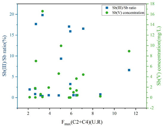 Plots depicting the Sb(V) concentration and the oxidation ratio of Sb(III)/Sb versus fluorescence intensity of the combined proportions of C2 and C4 in LDOM groundwater.