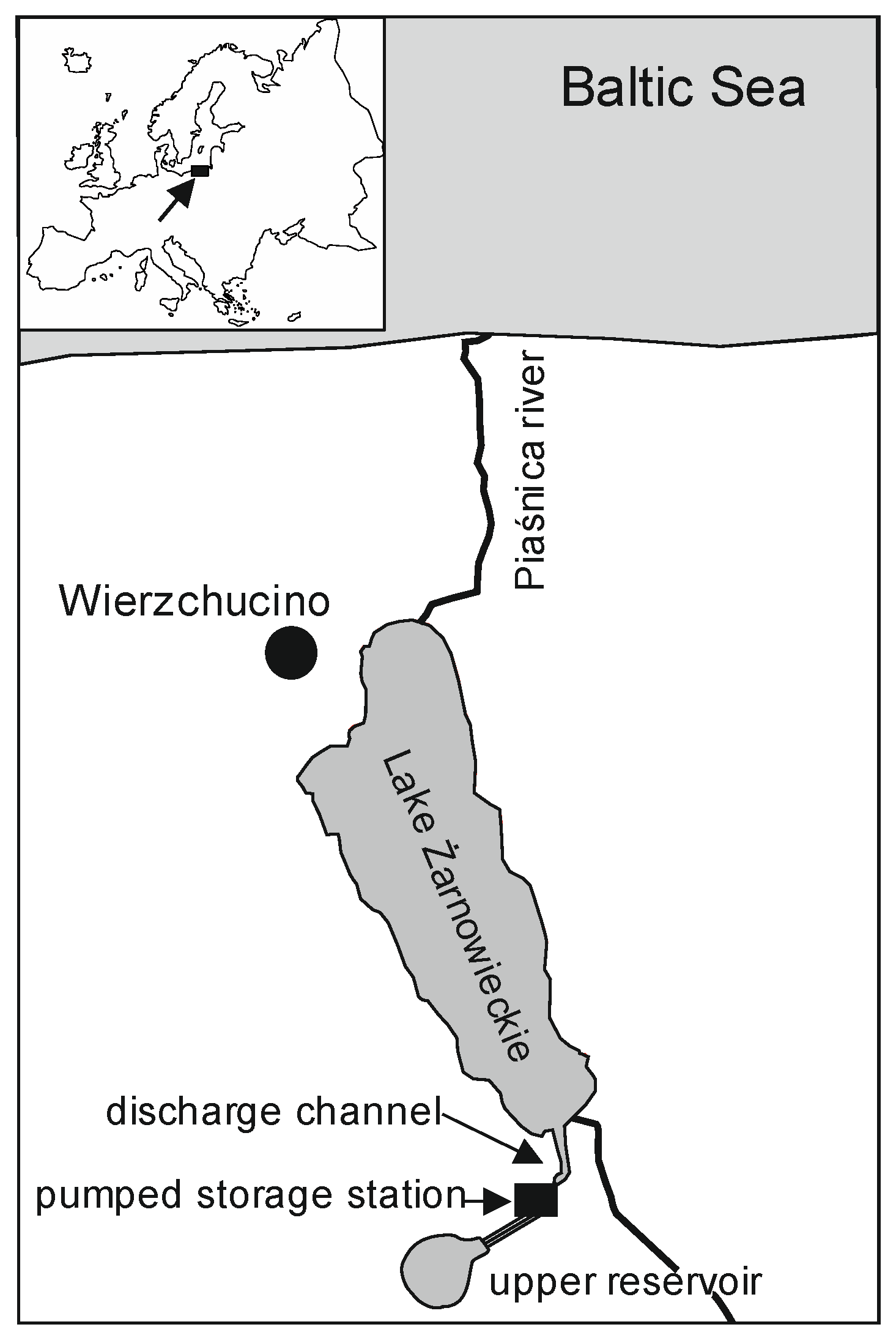 - Afanasjew, S.A.; Protasow, A.A.; Zdanowski, B. The composition and structure of zoobenthos in the littoral zone of the lake and in the channel and upper reservoir of the power plant. In The condition of Lake Żarnowieckie After 10 Years of Operation of the Pumped Storage Power Plant; Majewski, W., Ed.; Publishing House of the Warsaw University of Technology: Warsaw, Poland, 1996. (In Polish) [Google Scholar]