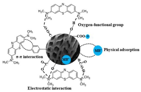 Methylene blue adsorption mechanisms in biochar (adapted from [10]).