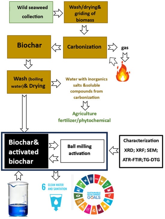 The char sorbents were prepared by slow carbonization of a brown seaweed mixture (Table 3), collected in the coastal areas of Portugal. Different species of marine algae were collected by hand from Praia de Alpertuche, Setúbal (38°28′4.93′′ N, 8°59′22.27′′ W) on three different dates: 28 May 2022, 4 July 2022, and 5 November 2022, to guarantee a more representative sample of the collected marine algae. The experimental procedure is summarized in Figure 4 as a block diagram. This figure also presents the hypothesis of utilizing the carbonization gas to supply the energy required for the process and recovering coal washing water for fertilizer or agricultural phytochemical production. The washing water, enriched with minerals like potassium (K) and soluble organic compounds from sugar carbonization, holds potential for agricultural applications. However, these two stages are not analyzed in the following sections, as they are still under development.