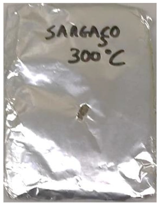 After grinding in a blade mill, the biomass was sieved and the fractions above 750 mm were subjected to a new grinding process. Carbonization in a muffle was carried out by wrapping 10 g of biomass in an envelope (with four layers, around 3 g), of aluminum foil (Figure 5), leaving a small hole for the gases formed to escape, thus maintaining a non-oxidizing atmosphere during the process. The char samples were prepared at 300 °C and 400 °C. The carbonization temperature was chosen from the thermal degradation profile under nitrogen flow. The thermogram was acquired at 20 °C/min, under N2 flow, using a Netzsch STA490 PC thermobalance. An alumina crucible with 60 mg of the powdered sargaço was used.