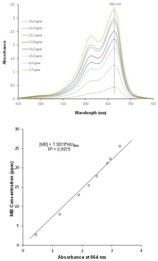 UV-Vis spectra and calibration curve for methylene blue quantification.