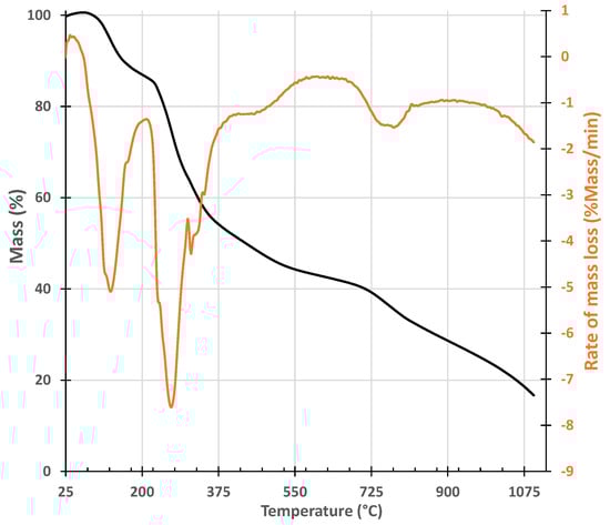 The sargaço biomass was characterized by thermogravimetry under N2 flow to select the carbonization temperature. The thermal degradation profile in Figure 7 shows that at 400 °C the biomass has already suffered the greatest loss of mass, which occurs at a maximum rate of around 270 °C. Given the thermogravimetry data, 300 °C and 400 °C were chosen as the carbonization temperatures. The selected carbonization temperatures are in line with the data of Wang et al. [22], which show that the devolatilization stage of seaweed biomass occurs between 200 °C and 550 °C.