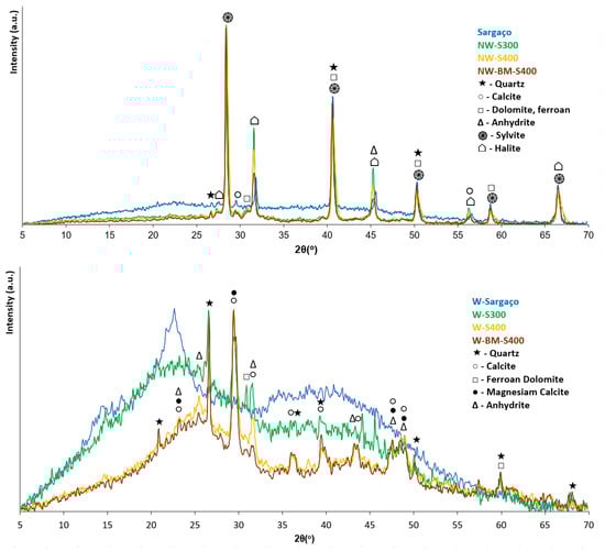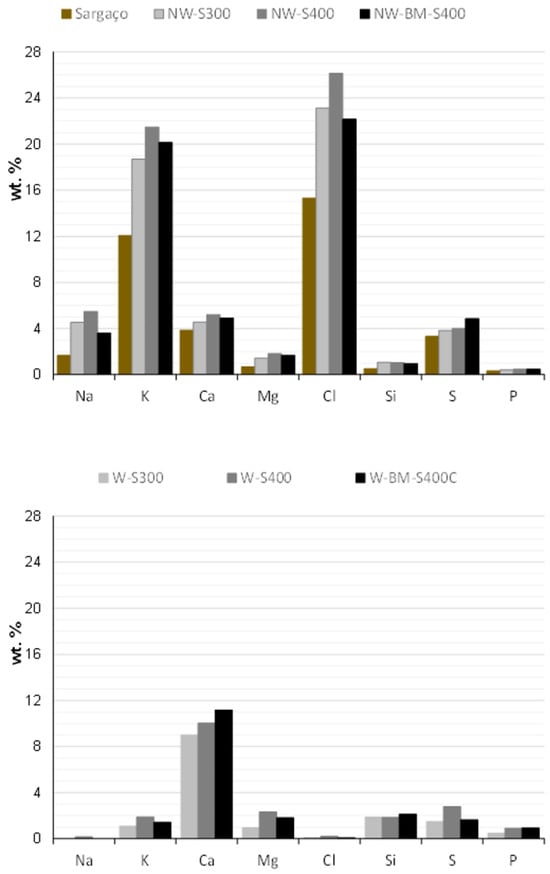 The XRD data (Figure 13) also confirms the high inorganic content of biochar samples. The diffractograms show diffraction lines of alkali crystalline salts such as sylvite, halite, calcite, dolomite, and anhydrite overlapped with XRD lines belonging to quartz. The same XRD lines were observed for sargaço which is consistent with the high mineral content reported for the seaweed biomass [32]. Other researchers [33] reported a substantial inorganic content in seaweed-derived biochar, highlighting a key distinction from wood-derived biochar.