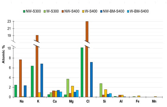 After carbonization, the biomass was converted into a dark gray/black material with char yields and pH summarized in Table 4. The char yields agree with recently published data, which emphasizes that the yield depends on the carbonization temperature and the type of seaweed used [9]. The high content of alkali in seaweed biomass (Figure 8) can contribute to prompt gasification during carbonization thus decreasing the char yield [23]. All the prepared biochar presents an alkaline character due to inorganics, such as K, and the organic surface groups such as -COO- and -O- [24]. The biochar-washed samples present lower pH values due to the leaching of alkali salts.
