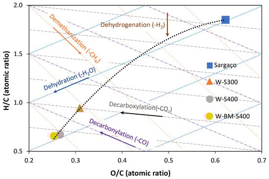 The predicted reaction path from raw biomass to chars, the dashed line, shows that the dehydration processes are dominant in the carbonization of sargaço, because the dehydration vector and the path are close. This observation is in line with what has been reported in the literature for the carbonization of sugars, which are the major components of seaweed [34]. As expected, higher carbonization temperature raises the loss of oxygen-containing species, decreasing the O/C ratio [35]. Ball milling for 1 h very slightly decreased O and H atomic percentages, and increased C atomic percentages, though it reduced H/C and O/C ratios (Figure 10). The same results were obtained by Timko et al. [31] studying glucose hydrothermal char.