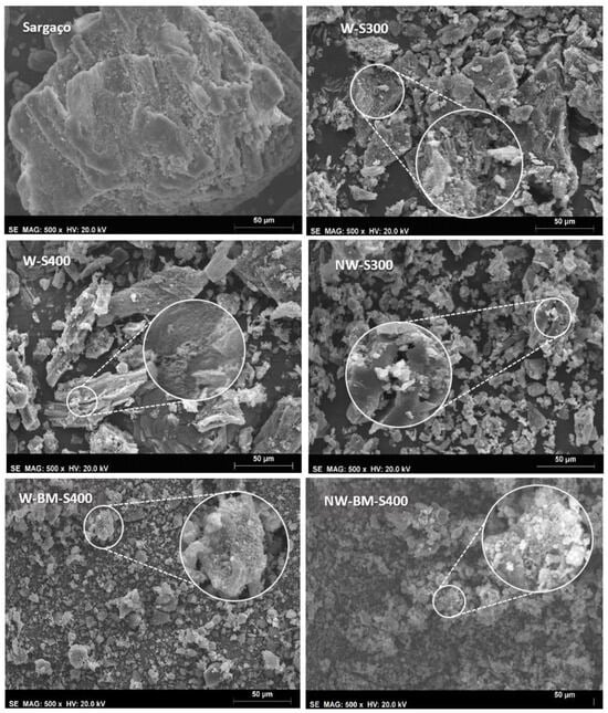 Micrographs of non-washed char show inorganic materials agglomerates that are absent in washed chars. The morphology of char produced at 300 °C and 400 °C (Figure 11) by slow carbonization is less spongy than that reported in the literature for char produced by high-temperature pyrolysis (>600 °C), which implies a smaller surface area available for the adsorption of pollutants.