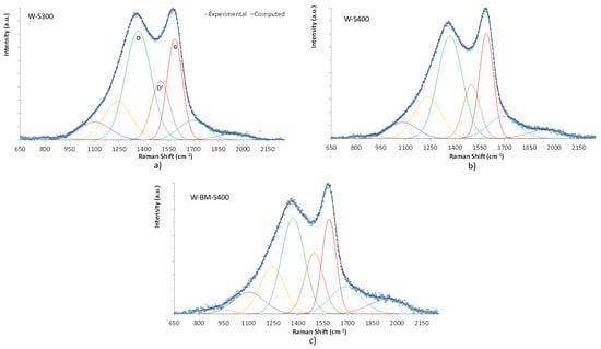 The graphitization Index of the produced biochars was evaluated by Raman spectroscopy (Figure 12). Data from spectra deconvolution showed ID/IG values of 1.81, 1.70, and 1.67 for washed samples prepared at 300 °C, 400 °C, and ball mill, respectively. As expected, char graphitization increases raising the carbonization temperature [28] and ball milling also has a benefit on this char feature. In the spectral region between the D and G bands appears the D’ band, around 1500 cm−1, which results from defects induced by heteroatoms. This band results from the PAH (polycyclic aromatic hydrocarbons) moieties’ combined vibration modes, mostly caused by N or O functional groups [29]. The ball-milled sample (W-BM-S400) exhibits a more intense D’ band (ID’/ID = 0.52) compared to the other two samples (0.38 at 300 °C and 0.35 at 400 °C), indicating that the ball milling treatment promotes the formation of oxygen-containing functional groups. Moreover, such treatment also increases the surface exposure of the preexistent functional groups [30]. The changes introduced by the ball milling occur through a radical mechanism [31] which allows rearrangements with the formation of aromatic groups with more units or termination with oxygenated groups.