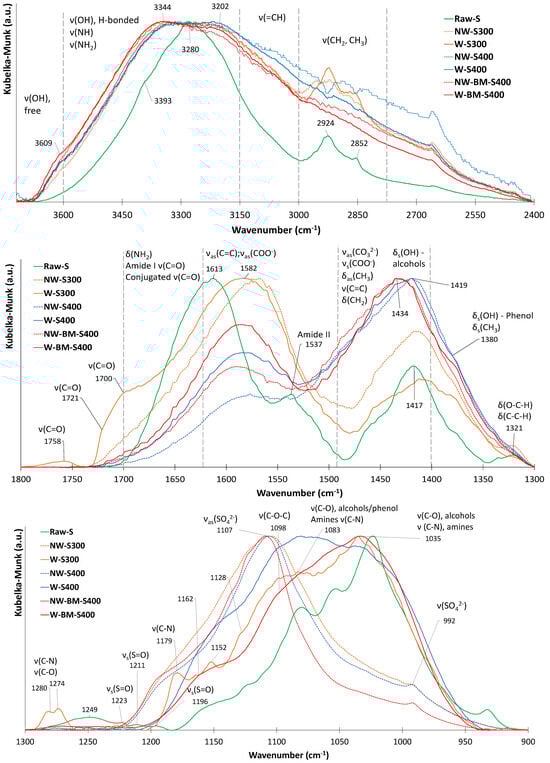 The functional group on the char surface and the MB adsorbed species were evaluated by ATR-FTIR. Figure 14 presents the IR reflectance spectra of the biochars before MB adsorption, along with the raw biomass, with vibration mode assignments based on data from the literature.