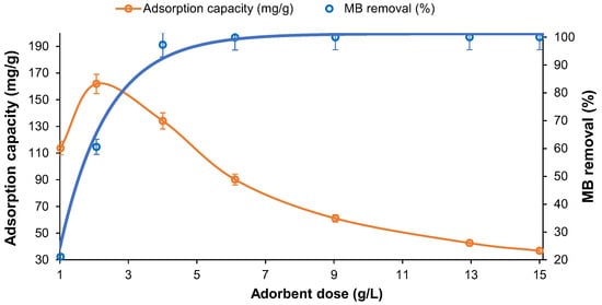 Effect of the adsorbent dosage on the adsorption capacity and MB removal (W-BM-400, 40 °C; [MB]o = 520.5 ppm).