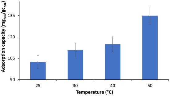The temperature effect was studied and the results in Figure 16 show that the char MB adsorption capacity increases with temperature, which is in line with thermodynamic studies that indicate that the adsorption process is spontaneous and endothermic, i.e., favored by an increase in temperature [41].
