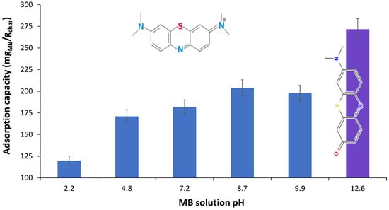At pH = 12.6, the methylene blue solution loses its distinctive blue hue and turns purple, indicating a structural shift in the molecule that appears to assist removal from the solution by adsorption onto the biochar. The literature claims that high pH aids in the removal of MB [44]. In any scenario, high pH values are prohibited from the standpoint of wastewater treatment process sustainability.