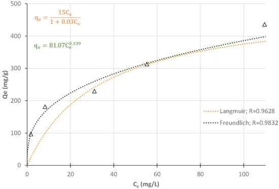 Equilibrium data from the isothermal adsorption study at 40 °C were fitted using the Langmuir (Equation (1)) [45] and Freundlich (Equation (2)) isotherms (Figure 18).